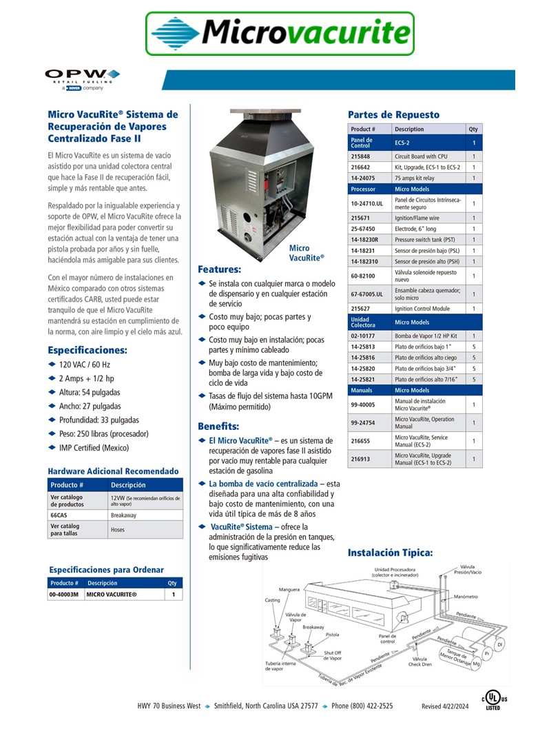 El Micro Vacurite® es un sistema de recuperación de vapores fase II asistido por vacío muy rentable para cualquier Estación de Gasolina.